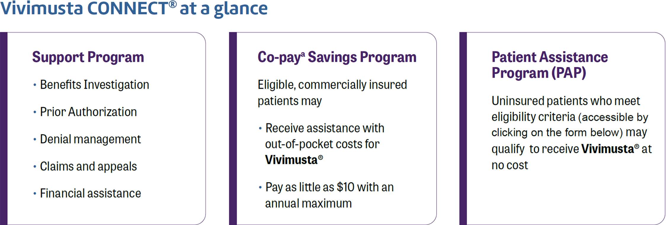 By using the Vivimusta CONNECT® Co-pay Program you certify that you meet the eligibility criteria and will comply with the Terms and Conditions described below.